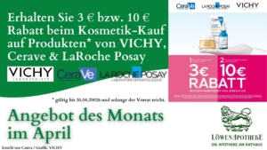 Für Ihren Kosmetik-Einkauf erhalten Sie beim Kauf von VICHY-, CERAVE- und LaRochePosay-Produkten 3 Euro Rabatt* – beim Kauf von 2 Produkten bereits 10 Euro
